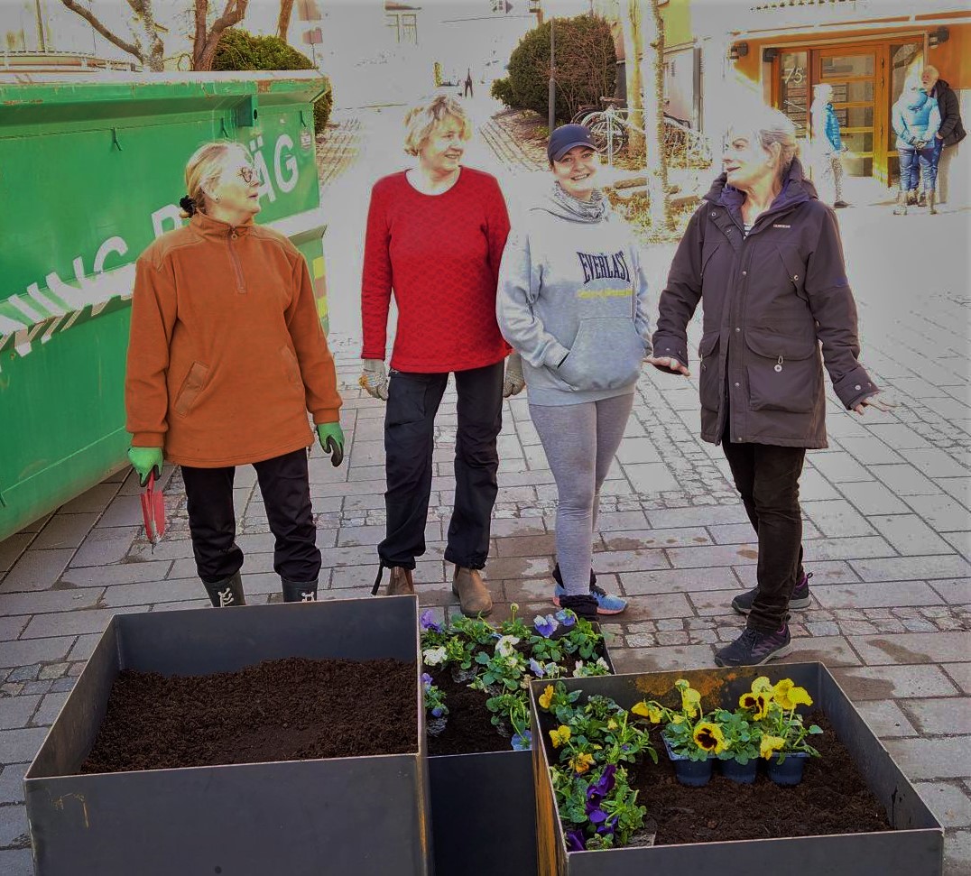 Nu står tre nya krukor stadigt på samma plats. De är fyllda med flera säckar lecakulor och jord, och de första blommorna. Trädgårdsgruppen planerar att plantera ett mindre träd i den största krukan så snart vårvärmen kommer tillbaka.